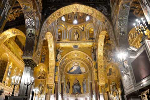 - Kaple Palatina, postavená v roce 1132, je uvnitř zdobena nádhernými byzantskými mozaikami, arabskými štukovými stropy a normanskými architektonickými prvky. Výzdoba zahrnuje scény ze Starého i Nového zákona.