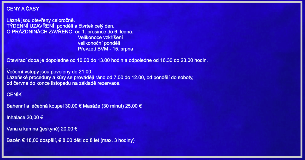 Bazény jsou v provozu celoročně s přestávkou od 1. prosince do 6. ledna. Zařízení je uzavřeno v pondělí a ve čtvrtek. Provozovna je otevřena ráno od 10:00 do 13:00 a odpoledne od 16:30 do 24:00